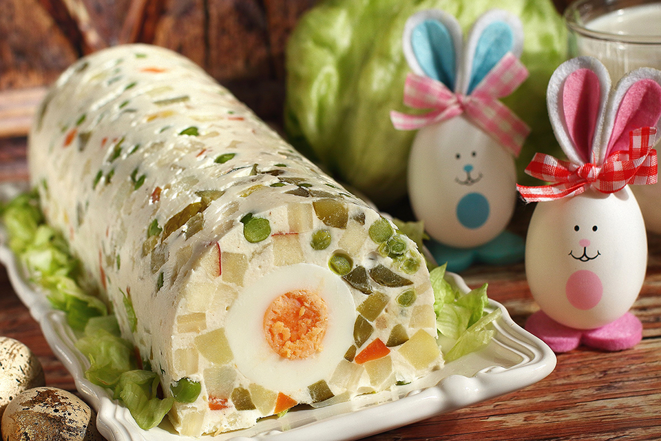 Hozzákeverjük a forró vízben feloldott zselatint. Összeforgatjuk a zöldségekkel, az uborkával és az almával, majd háztartási fóliával vagy szilikonlappal bélelt alagútformába töltjük a saláta harmadát. Rárakosgatjuk a tojásokat, végül ráöntjük a maradék salátát. Elsimítjuk a tetejét. Befedjük fóliával, és minimum 3 órára, de még jobb, ha egész éjszakára hűtőszekrénybe tesszük dermedni. Sonka, csülök, füstölt tarja mellé remek köret. Őzgerinc formában is elkészíthető, ebben az esetben a zöldségek mennyiségét 5-5 dkg-val növeljük meg, illetve tojásból is 2-3 darabbal többet főzzünk hozzá.