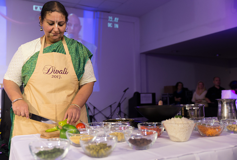 Ezt követően rendhagyó főzőshow-val készültek a szervezők. A bemutatónk három szereplője volt: a népszerű vegetáriánus blogger, Hémangi déví dászí, aki korábban évekig élt a somogyvámosi Krisna-völgyben; Gaura-kírtana Dász, vagyis Gyulai Gábor és Kundaváli déví dászí, azaz Haddad Nóra, aki öt évet töltött keleten, ott fejlesztette főzőtudományát magas szintre. A szakácsok egymás mellett felállított három asztalon készítettek vegetáriánus ételeket.