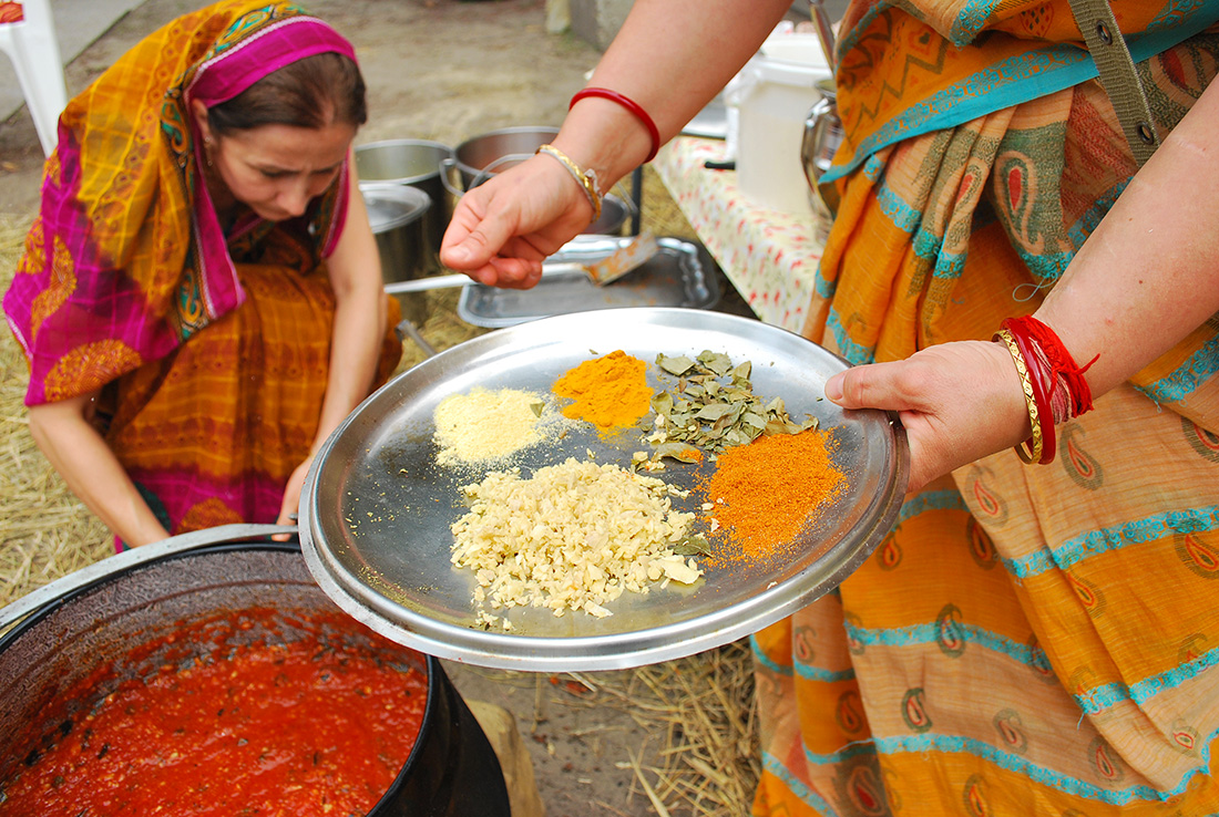 Közel 40 féle vegán ételkülönlegességet lehet majd megízlelni, miközben gyönyörködhetünk a hagyományos indiai agyagtűzhelyen való főzés látványában. A szakácsok látványos főzőbemutatóval is készülnek, ahol a szabadtéri tűzön készített csemegéket is meg lehet kóstolni. A kínálatban megtalálhatók lezsnek a szabdzsik (zöldséges főételek), különleges rizsek, közkedvelt csatnik (édes-csípős szószok), egzotikus csemegék, lepénykenyerek, édességek és aromás italok.