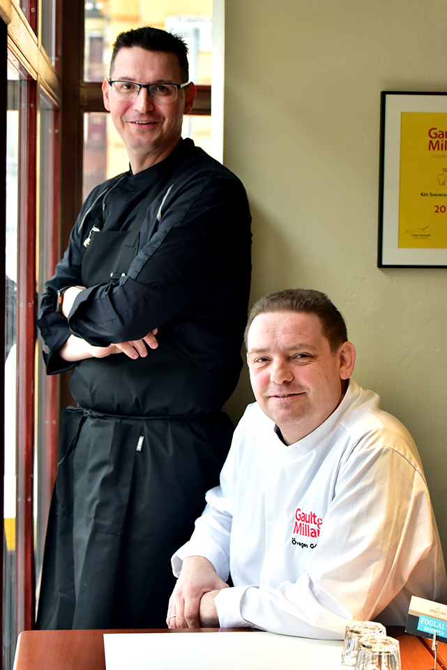 Aki a Paulay (egykor 2 Mohren, azaz Két Szerecsen) utca felől közelíti meg a vendéglátóhelyet, azt olvashatja a cégéren: Kávéház. Befordulva a Nagymező utcára viszont azt látja: Két Szerecsen Bisztró. A látszólagos ellentmondás rögtön megoldódik, ha tudjuk: a hely reggeltől késő estig nyitva tart, akárcsak egykoron a kávéházak, kínál kávé mellett reggelit, ebédet, emellett operál állandó étlappal és séfajánlattal is. Öveges Gáborral séffel és Kriski Zoltán séfhelyettessel beszélgettünk, akik közel két évtizede irányítják a Két Szerecsen konyháját.