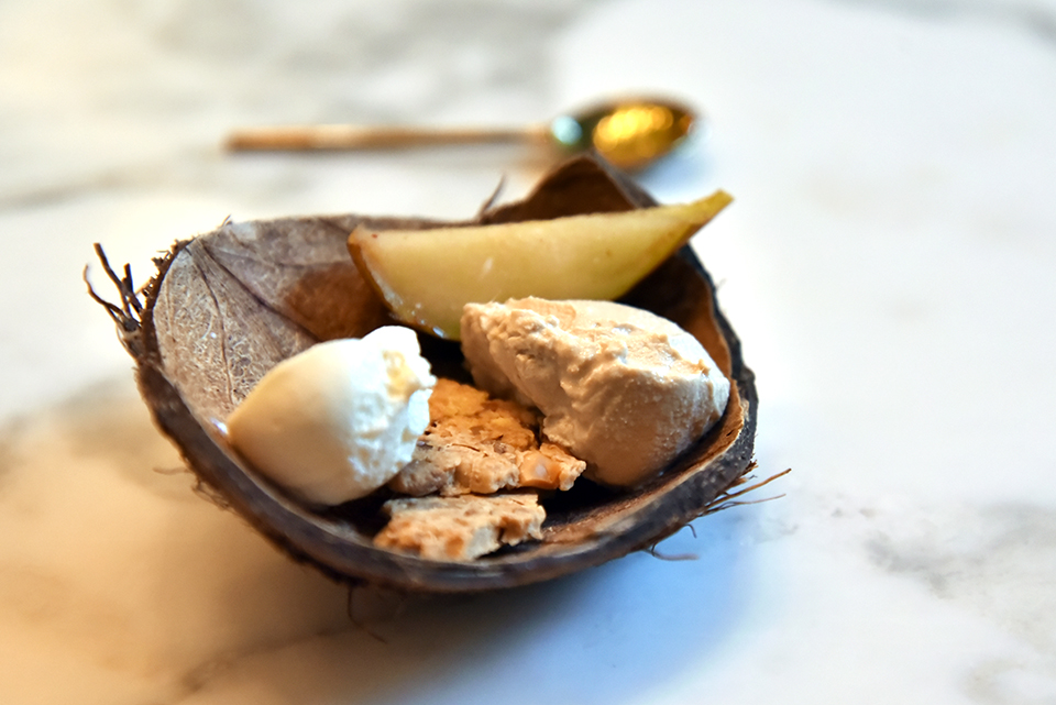 A negyedik ízelítő a desszert. Desszert? Varga Dánieltől kóstoltunk már meghökkentő édességet (erről EBBEN A CIKKBEN OLVASHAT), amely némileg hasonlított is a most felszolgáltra. Kókuszhéjon érkezett a kókusztejjel készült házi mogyorókrém, amit kecskesajthab, thai paprikás körte egészített ki, mindez mogyorótöret ágyon. Zseniális.