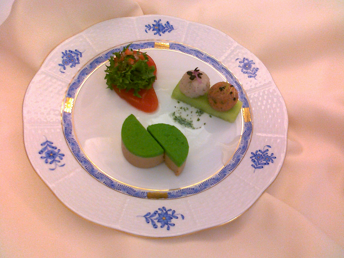 Az előétel az említett libamáj au torchon lesz, marinált őszibarackkal, rózsaborsos pisztáciamorzsával és sós karamellel. Kerül még a tányérra zöldalmás-bodzás mangalica rilette, savanyított kelvirágrózsákkal és házi bagettel. Ezután szürkemarhából készült erőlevest kanalazhatnak a vendégek, a levest zöldfűszeres roláddal, idényzöldségekkel szolgálják fel.