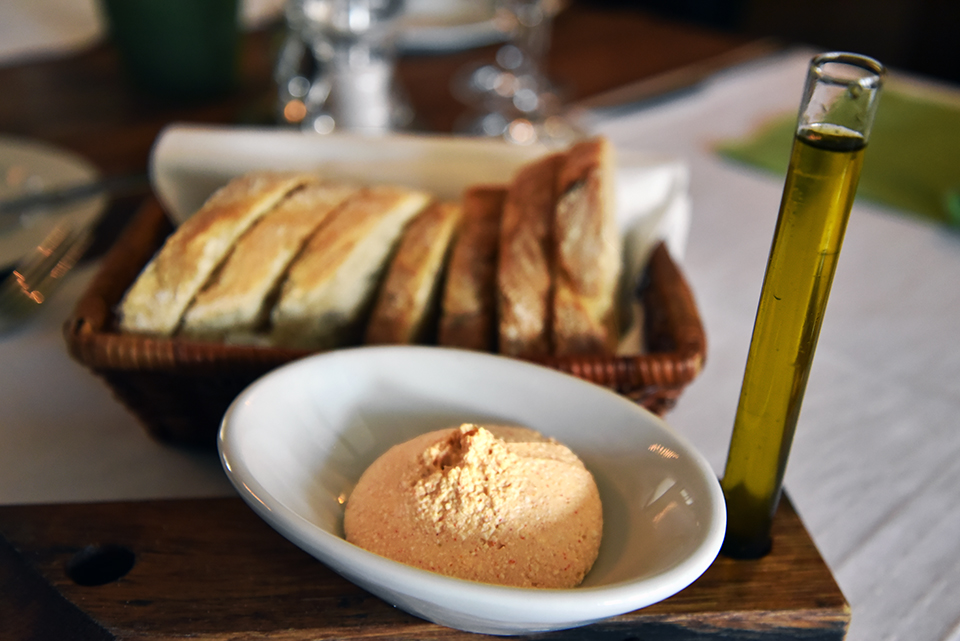 A pincérek kedvesek és segítőkészek, egységes egyenruhában szolgálnak fel. Míg a levesre várunk, körözöttel érkezik egyikük, továbbá házi jellegű kenyérrel és: egy kémcsőben szőlőmagolajjal. Ez utóbbi egyszerűen frenetikus, kiöntjük a tányérra, belemártjuk a kenyeret, s úgy tűnik, mintha egy csettintésre egy borospincébe kerülnénk, ahol kitűnő borok illatai járnak tündértáncot. Emellett persze az olaj ízre is finom.