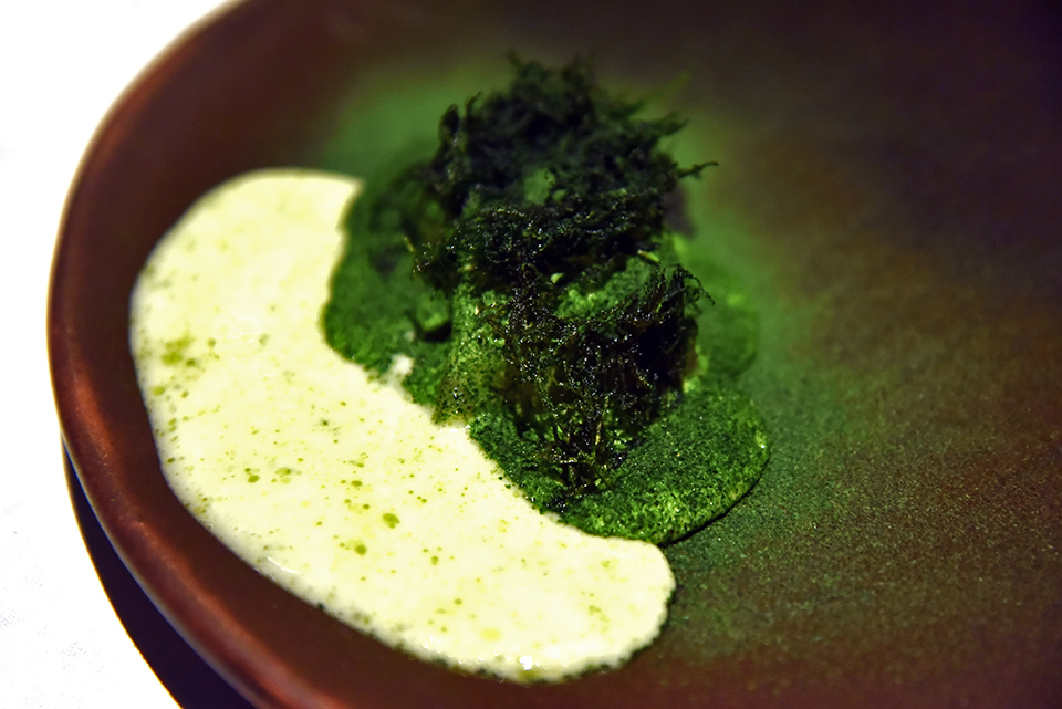 Elképesztő műremek. Talán ez a legjobb étel, gondoljuk míg az alga velouté és sült kaporlevelek alá rejtett fogást fogyasztjuk, de később még több alkalommal felül kell vizsgálni véleményünket. Most japán turisták ülnének be vacsorázni, ám őket is máskorra hívja vissza a manager.