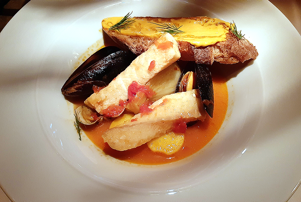 Ketten még kétszer tudunk teli tányért szedni, ami a gazdaságosság mellett kifejezetten balzsamozza a lelket. Persze mindez mit sem érne, ha szétmálló halhússal érkezne a leves, ám erről szó sincs, a halszeleteket szépen lehet szelni és kanalazni. A tányéron kapunk egy fűszervajjal gazdagon megkent pirítóst is, de a pincérek kedvesen még egy kosárnyi bagettet is felszelnek számunkra. Kellemesen telik az idő, mire elfogyasztjuk a hallét.