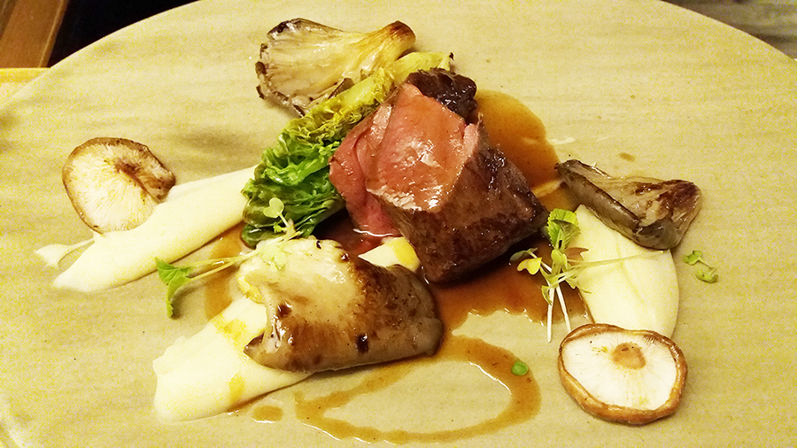 Báránycsülköt és vaddisznó szűzpecsenyét rendeltünk. A megérkezésünkkor még előzékeny kiszolgálás később picit hűvösebbre váltott, arra pedig grimaszokat kaptunk, miért nem kérjük a ház kenyerét kenegetőssel. Legalább félórát vártunk, mire megérkeztek a fogások. A szűzpecsenyének kevéssé éreztük vad bukéját, picit rágósra is sikerült, a köretek közül a zellerkrém viszont kiemelkedően ízletes, krémes, a pirított gomba pedig roppanós, kissé faszenes aromájú. A báránycsülök kitűnő, jól átsült, porhanyós, a hozzá kínált burgonya, spárga és néhány turbolyaszál csupán aláfestés a műremekhez.