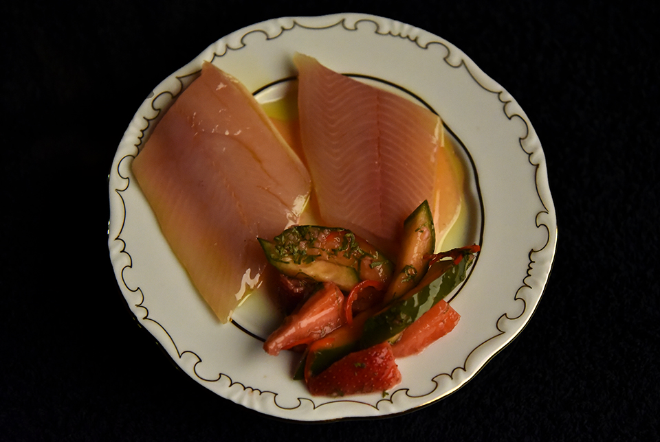 A harmadik körhöz még mindig semmit nem kell tennünk, csak az élményeknek átadni magunkat. A füstölt pisztrángot uborkasaláta társaságában fogyaszthatjuk el, utóbbi igen messze áll a mi általánosan e kisérőről alkotott képünktől. Ez ugyanis eperrel készül, így a savanyúság édes és savanyú is egyszerre, levének illatában inkább az eper dominál. A roppanós zöldséget és a puha gyümölcsöt aztán a „vendég” kötetlenül kombinálhatja a füstölt, tökéletes állagú pisztránggal.