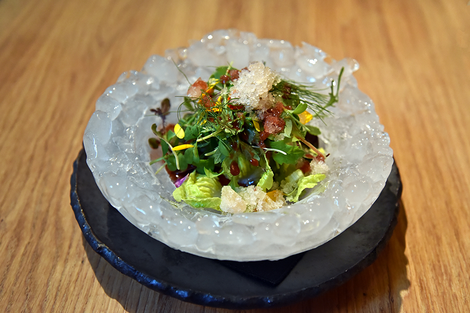 Az első (és egyben az utolsó) olyan eleme érkezik a menünek, amely külsőségében igazán meghökkentő. Eddig ugyanis a séf ügyelt arra, hogy a színház ne menjen az ételek rovására, ezért (is) kínálja kerámiákon, vásznakon az ételeket. „A” saláta azonban egy jégből faragott tálban kerül az asztalra. A hideg praktikus egy saláta esetében, egyben hűti is a feületére került uborka sorbet-t. a jégtányér figyelemfelkeltő, akár egy darab kristály.