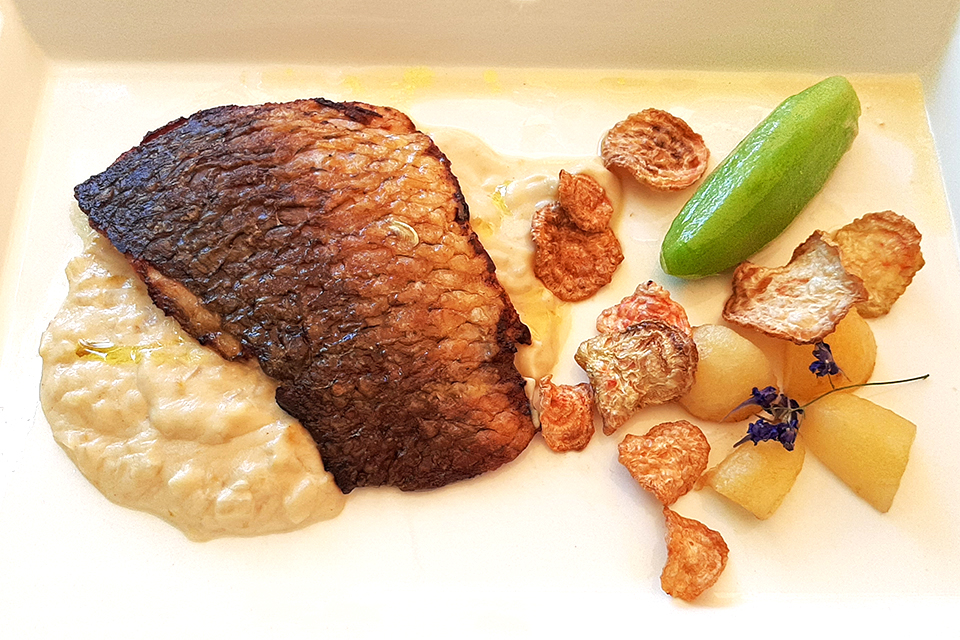 És akkor jöjjön a fénypont, a pontyfilé, citrusos karalábékrémmel, gyömbéres uborkával, céklachipsszel! Soha nem ettünk még sehol ilyen ízletesen elkészített pontyot. Hovatovább: írhatnánk azt is, elképzelhetetlennek tartottuk, hogy a sokszor pocsolyaízű, zsíros és szálkás halból bármiféle jó eledelt lehet készíteni a halászlét leszámítva. (Bár azt is jó minőségű alapanyaggal kellene készíteni!).