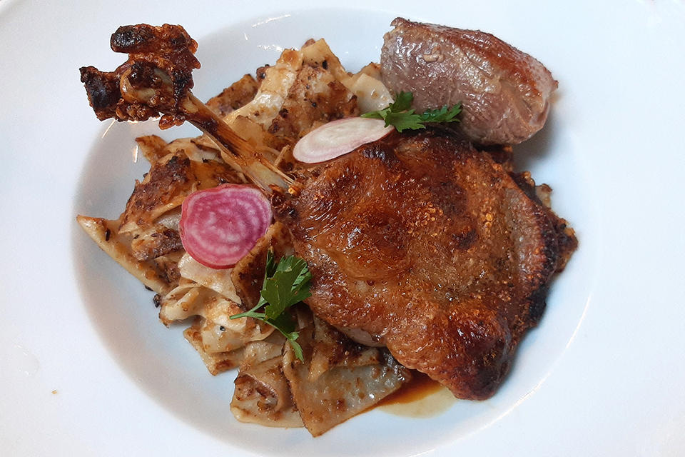 Utóbbit erősítheti, hogy a másik rendelés, a mangalica steak és pofahús zellerpürével, répa gratennel sem készült tökéletesre. A szűzpecsenye olyan keményre sült, hogy a kés – szó szerint – alig vitte. Hiába maradt omlós a pofa, vagy készült ízletesre a püré, mert csak mellékszereplők a tányéron a szűz mellett.