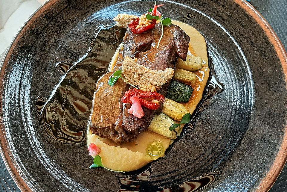 A másik választás a marhanyakra esett csicseriborsóval, cukkinivel és szezámmaggal. Ami, mint gyorsan kiderült, egy igen jó választásnak bizonyult, több okból is. Egyrészt a hús omlós, kellemes – bár ez az alap, mondhatnák most sokan, és amúgy igazuk is volna. De azért mégis. A csicseriborsó krémként ágyazott meg a húsnak, nem tolakodott, csak kiegészített, a roppanósra hagyott cukkinivel együtt.