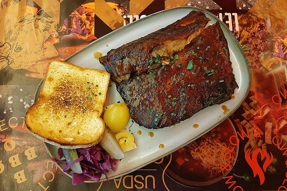És mi tagadás, tobzódik is, főleg, hogy egy neonfelirat alatt ülünk, ami szabad fordításban arra buzdít: fűszerezzük meg életünket. Vegyük sorra! A tányéron vegyes savanyúsággal kedveskedik a hely, valamint egy húspörzsanyagon pirított jókora toasttal. A hús pedig hatalmas, ahogy ígérték, kívül ropogós rubpáncél (az angol rub szó jelentése dörzsölni, ami a húsba dörzsölt szárazpác fűszerkeverékre utal) borítja, belül puha, omlós, karakteres.